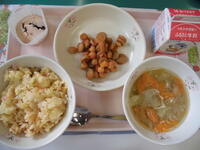 メロンパン 牛乳 ミートボールの野菜スープ たこナゲット 温野菜サラダ