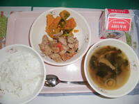 ごはん 牛乳 かみなり汁 鶏肉とあぶら麩の炒め煮 かぼちゃのサラダ