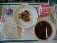 なす南蛮うどん いかのかりん揚げ 水まんじゅう 牛乳