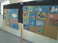 サマースクールの作品、夏休みの作品が掲示されています。