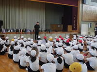 本日の児童集会は、児童会からのいじめをなくす取り組みについて、運動委員会から行進のポイント、音楽委員会から運動会の歌「ゴーゴーゴー」の3本立て。
