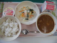 カレーライス 温野菜サラダ りんごゼリー 牛乳