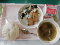 メロンパン 牛乳 ミートボールの野菜スープ たこナゲット 温野菜サラダ