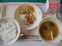 ごはん 牛乳 かぼちゃ団子の味噌汁 鶏肉のにんにくだれ キャベツの煮びたし